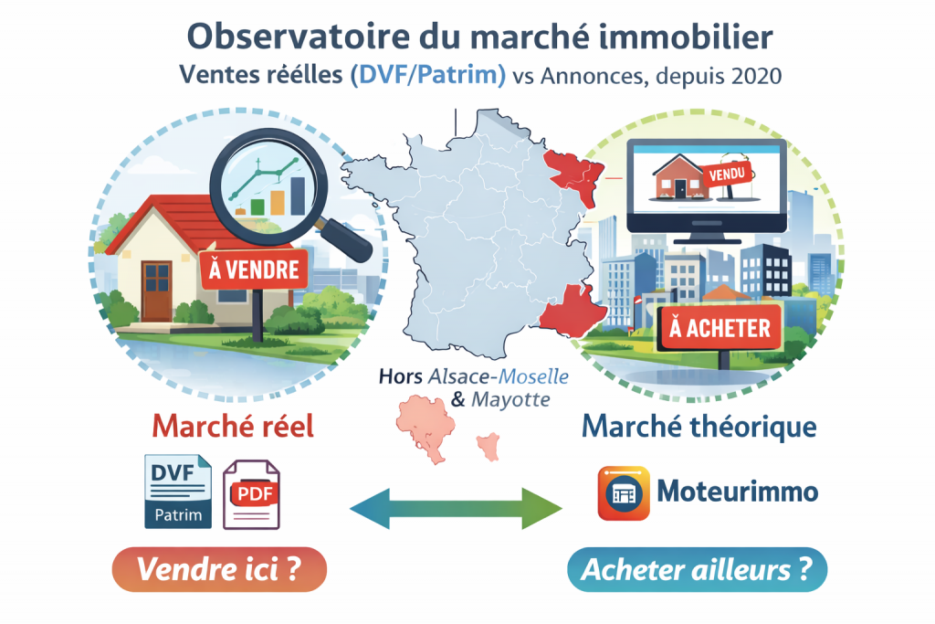 L’observatoire compare le marché réel (les ventes enregistrées) et, si vous le souhaitez, le marché théorique (les annonces) pour obtenir une lecture simple, chiffrée et vérifiable.
